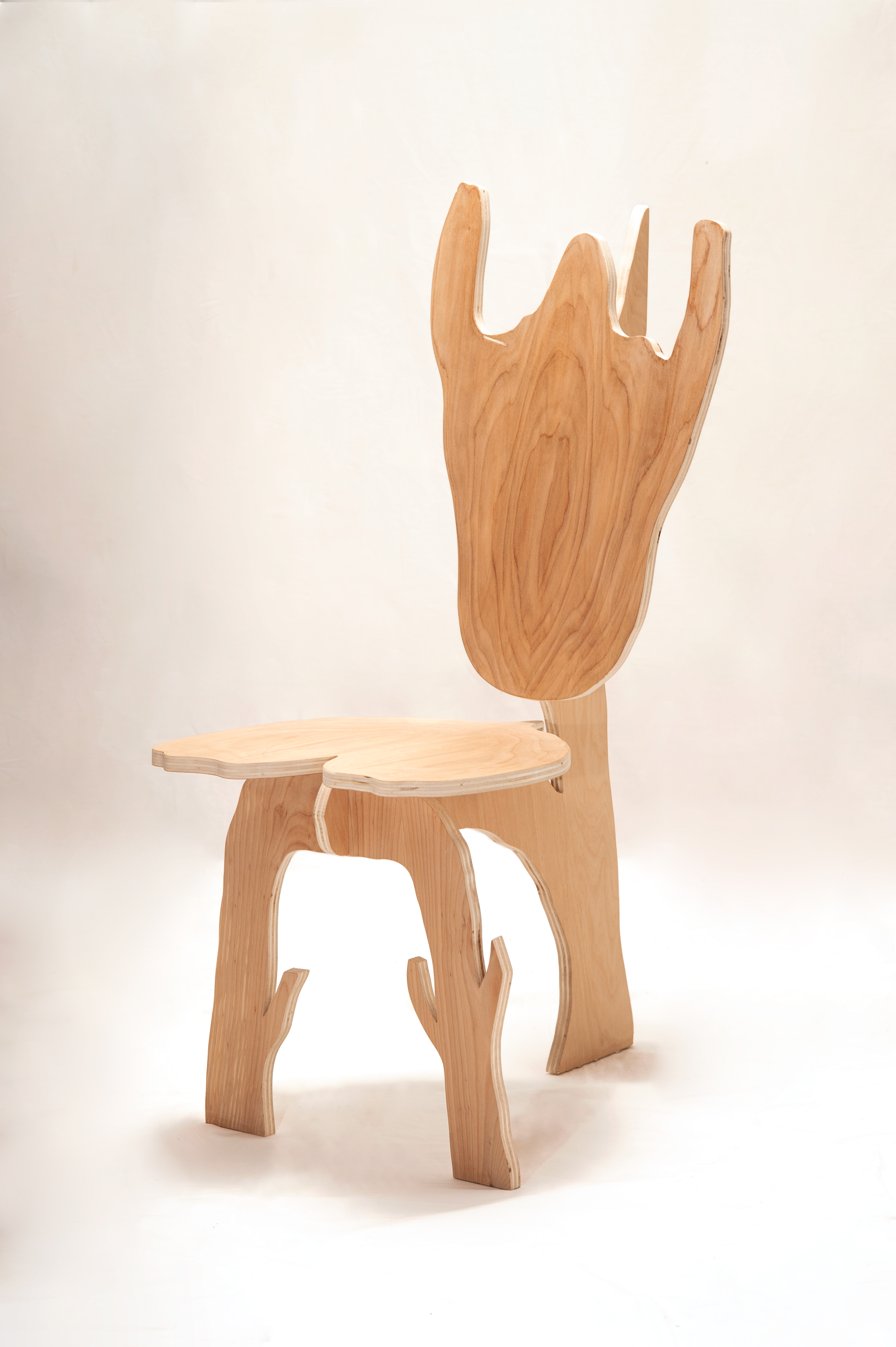 Tree Chair is a chair that mimics the forms of a tree in a cartoonishly stylized way. Its frame is made of over-simplified two-dimensional forms of a tree, while the seat and seat back are cut along the grain of the wood, using the found forms in the plywood, which as a material is itself a version of a tree.